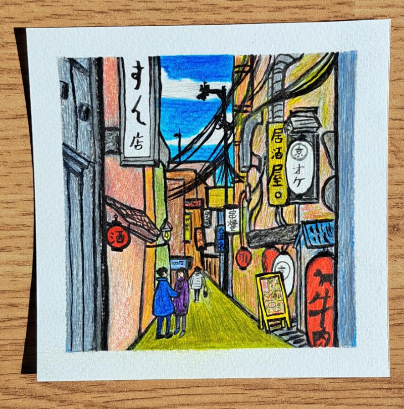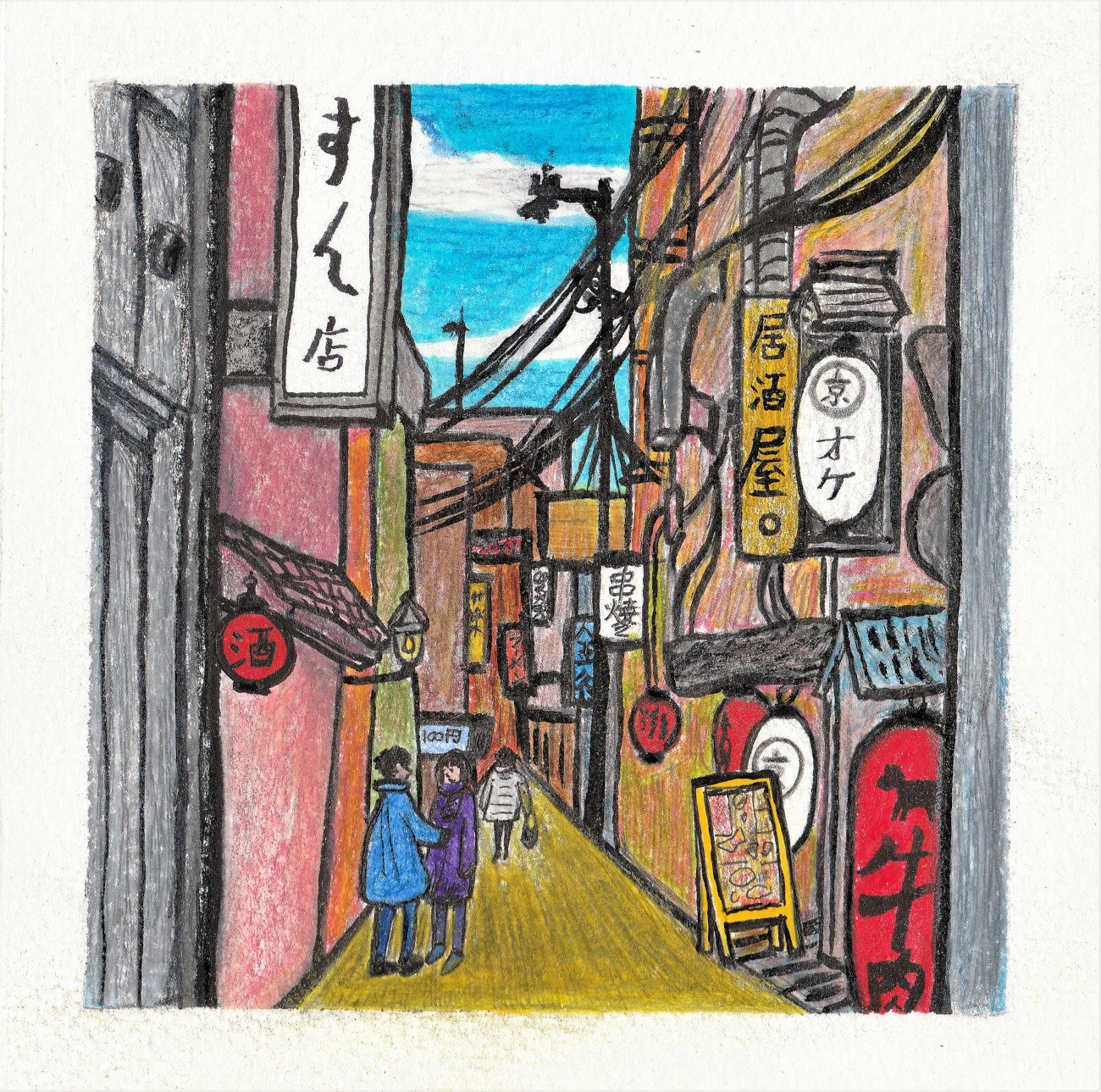 Voor deze serie 'Memories from Japan' heb ik geput uit mijn herinneringen en belevenissen in Japan: werken, wonen, reizen, studeren. Aan de hand van herinneringen en foto’s zet ik momentopnames om naar een tekening. Deze ‘Memories from Japan’ zijn omlijst door een wit kader. Door het vierkante formaat en het kader maak ik een speelse referentie naar polaroids.’
